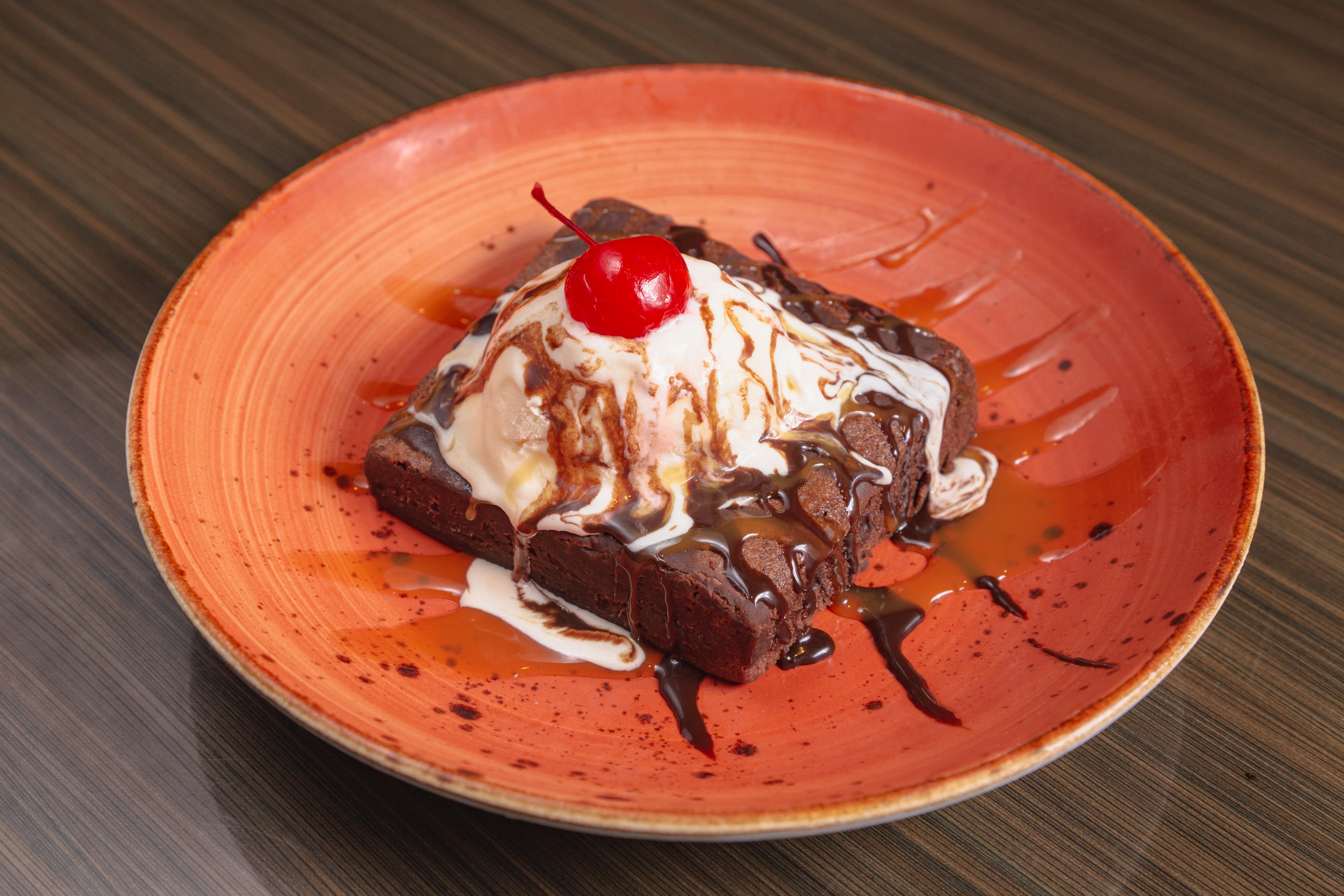 Warm brownie, vanilla ice cream, chocolate sauce, cherry