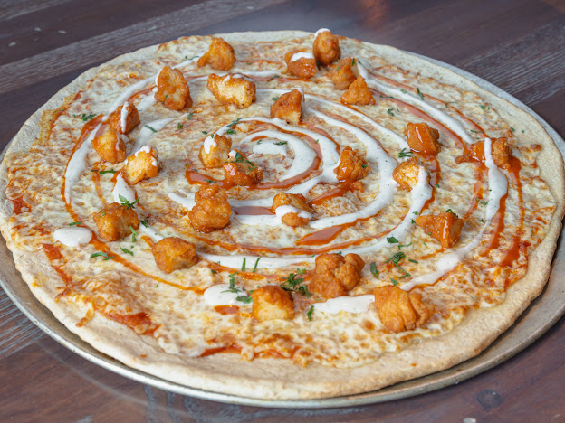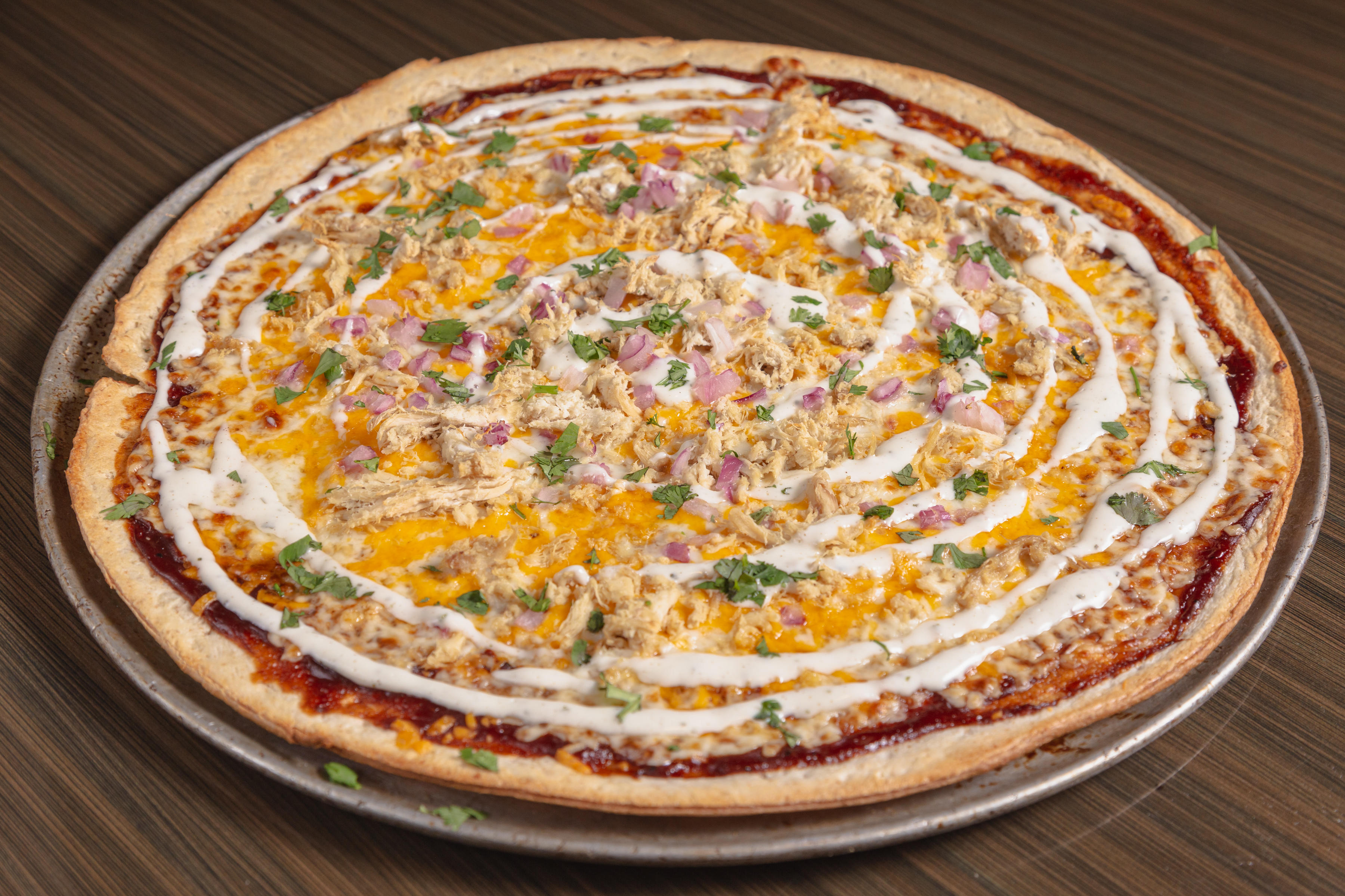 Smoky BBQ sauce, BBQ grilled chicken, mozzarella cheese, red onion, cilantro, smoked ranch dressing