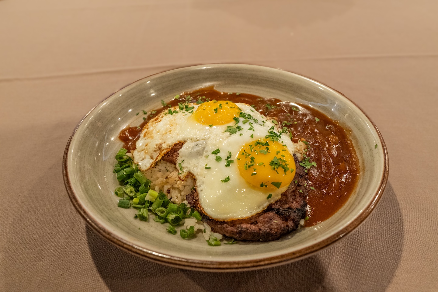 Two eggs, grilled beef patty, brown gravy, white rice, choice of toast