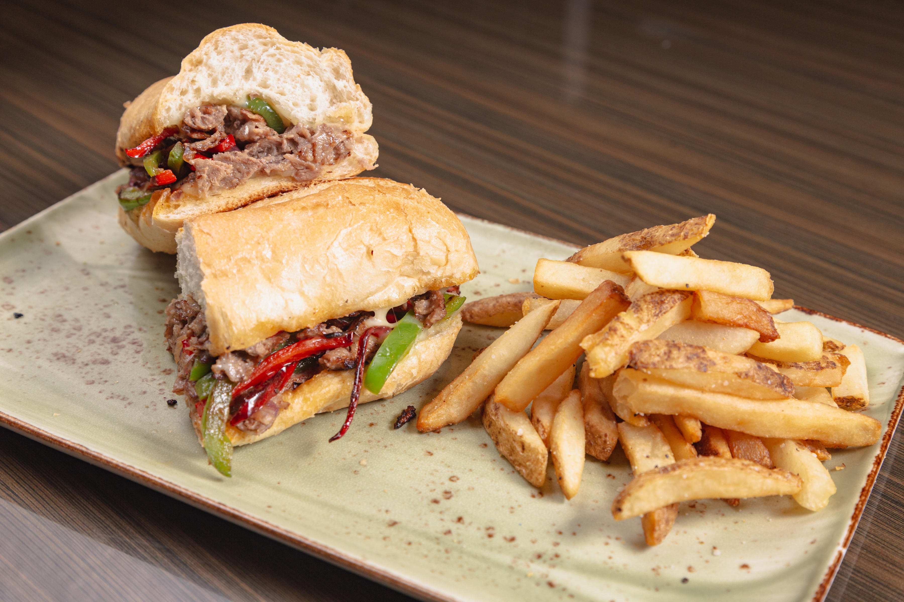Shaved steak, bell pepper, red onion, choice of cheese, hoagie roll
