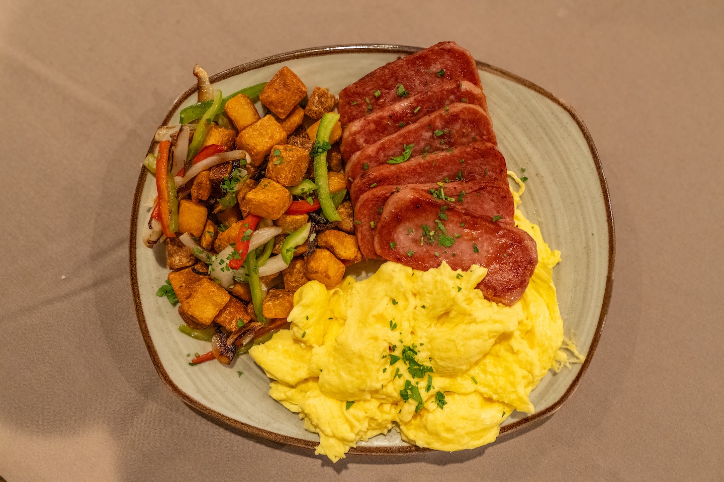Two eggs, teriyaki glazed spam, breakfast potatoes Available at Sierra Gold Jones only