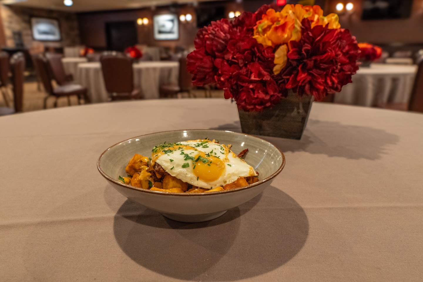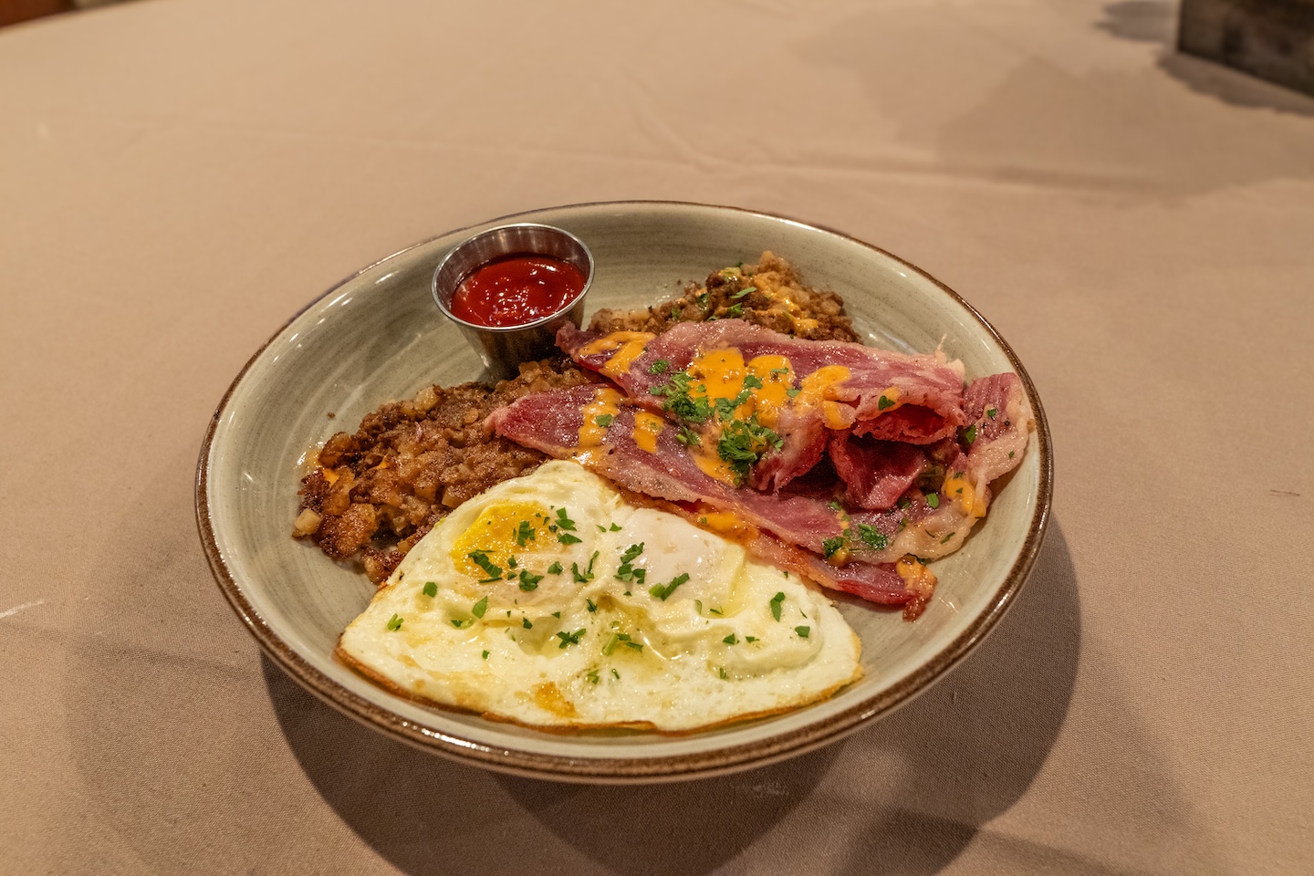 Two eggs, house-made hash, choice of toast breakfast potatoes, choice of toast Available at Sierra Gold Jones only