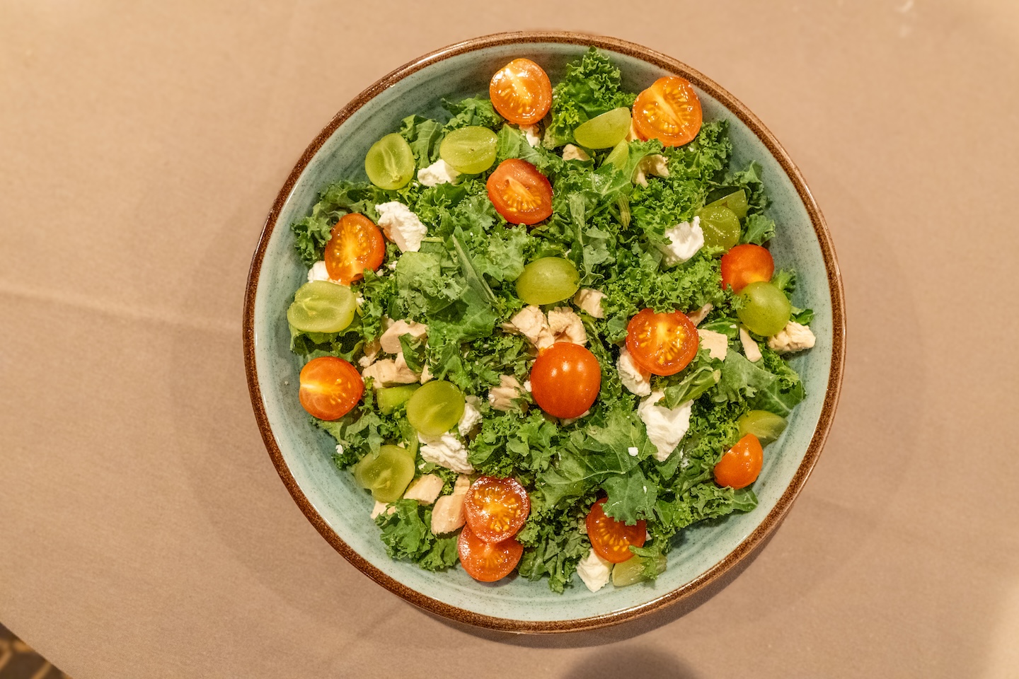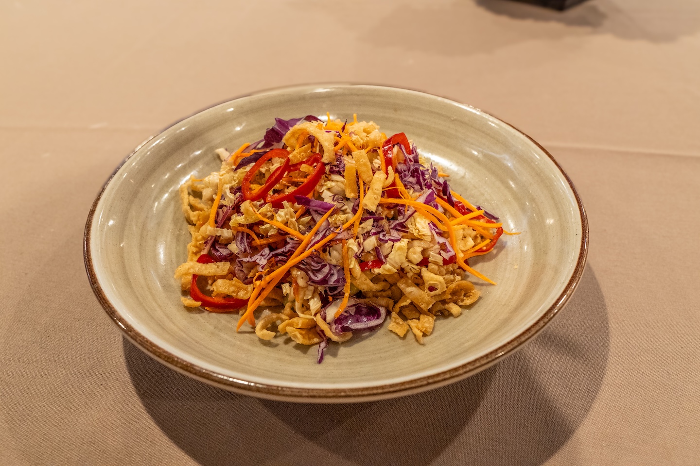 Napa cabbage, marinated chicken, cilantro, green onion, carrots, cucumbers, Fresno chili, red cabbage, wonton chips, sliced almonds, soy & ginger dressing