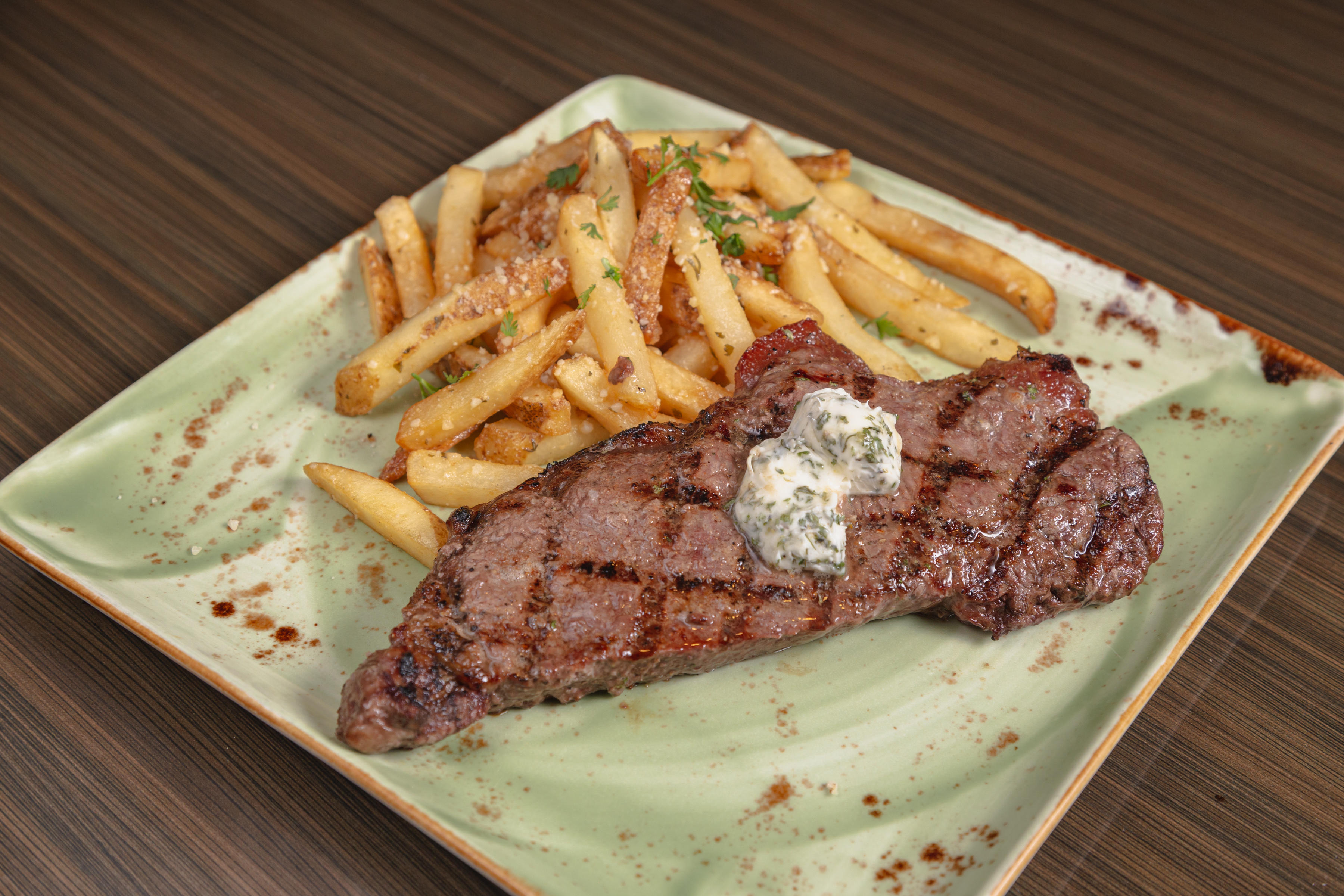 10oz grilled new york steak, SG steak butter, garlic parmesan fries
