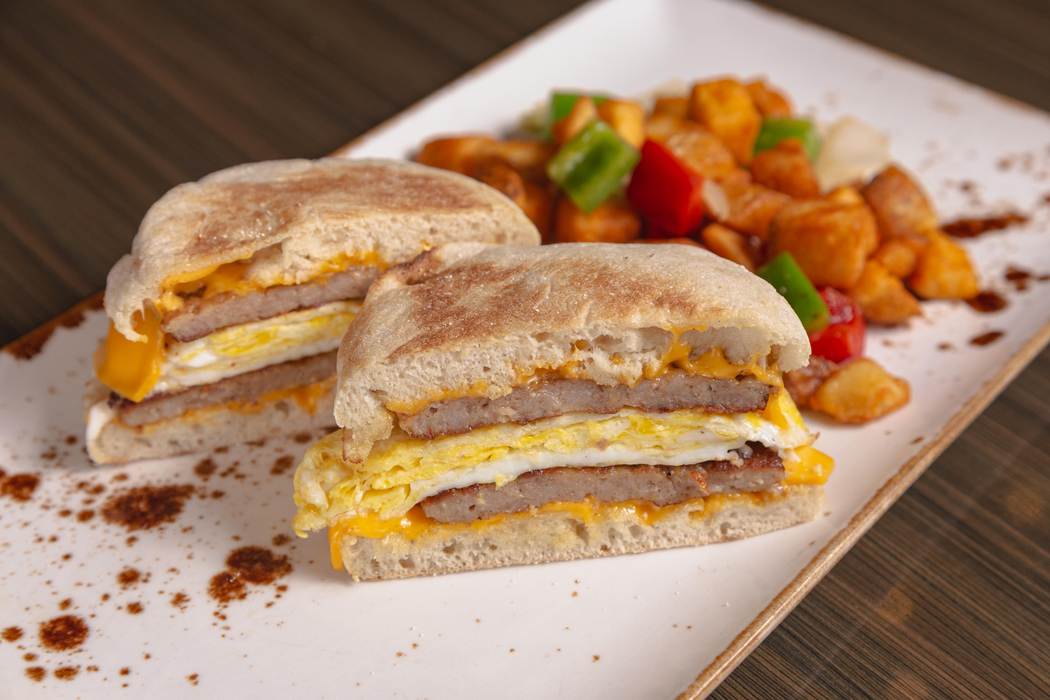 Smoked bacon or breakfast sausage, American cheese, scrambled eggs, brioche bun, breakfast potatoes