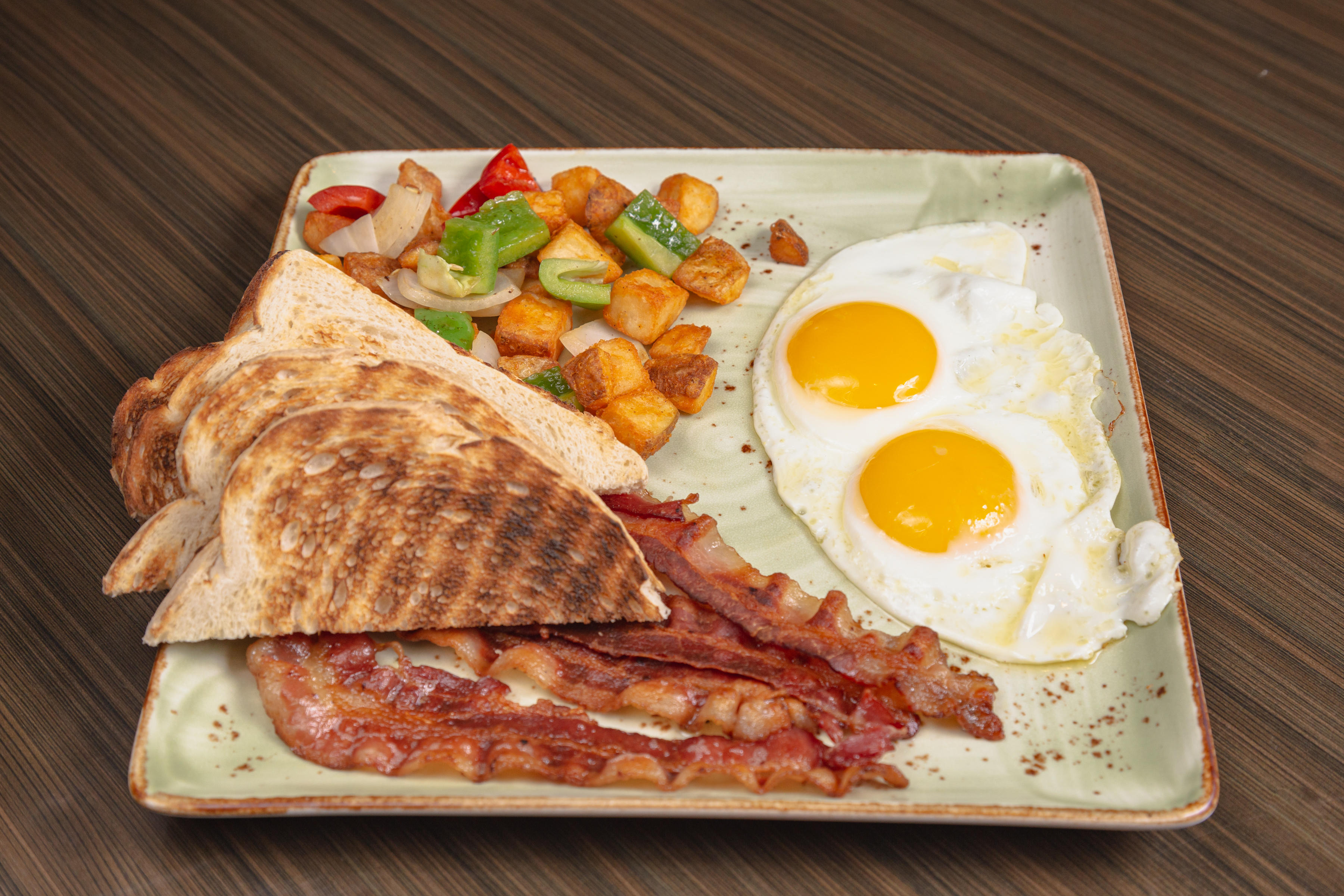 Two eggs, smoked bacon or breakfast sausage, breakfast potatoes, choice of toast