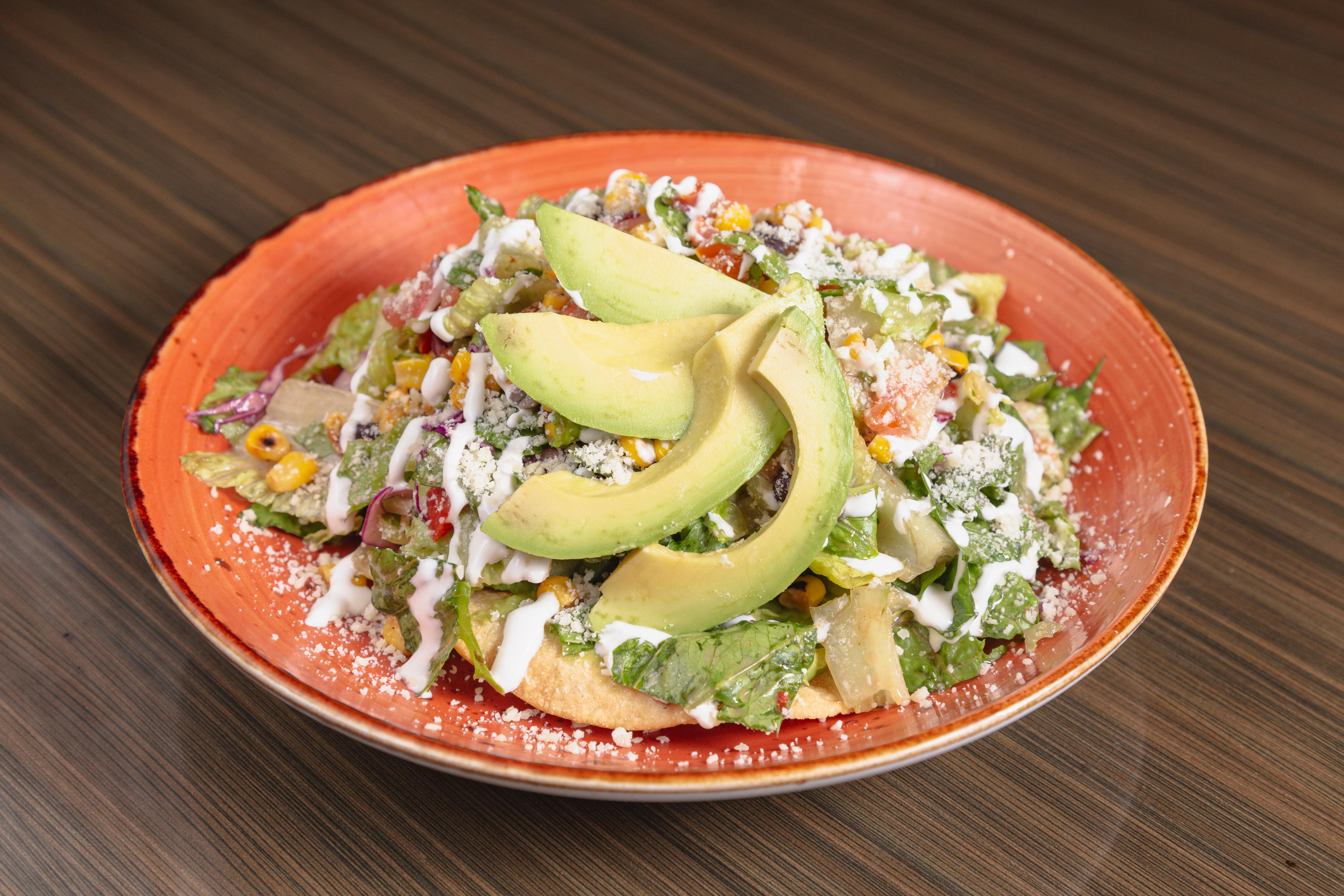 Romaine lettuce, Cajun chicken, avocado, corn, beans, tomato, red onion, tortilla strips, cheddar & pepper jack cheeses, spicy avocado ranch dressing