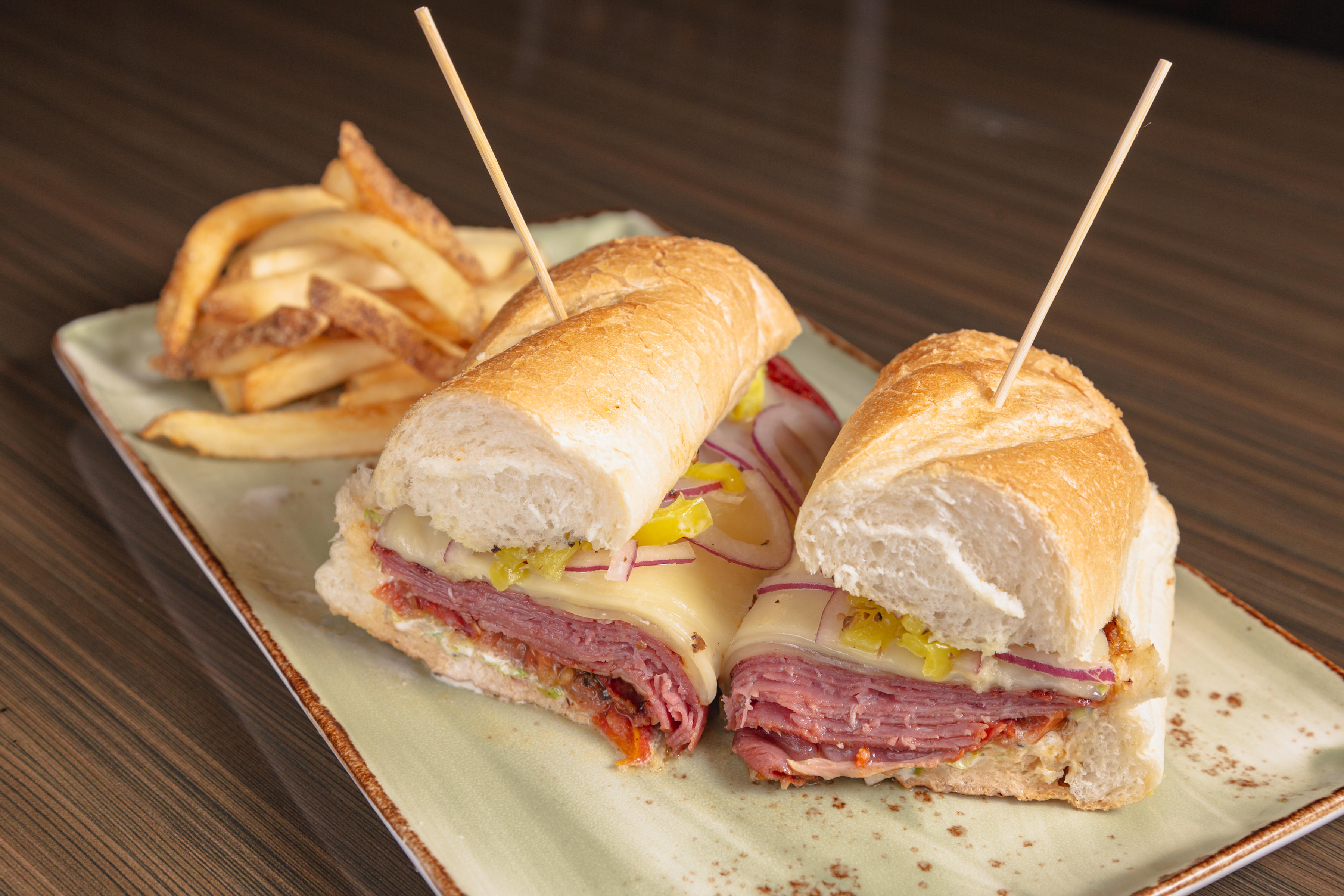 Salami, capicola, provolone cheese, lettuce, tomato, red onion, pepperoncini, red wine vinaigrette, mayo, hoagie roll