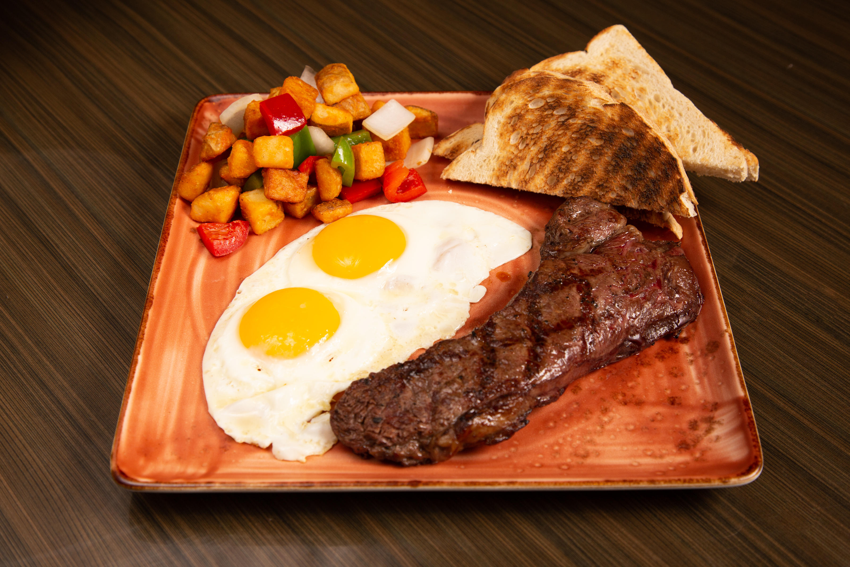 10oz grilled new york steak, two eggs, breakfast potatoes, choice of toast