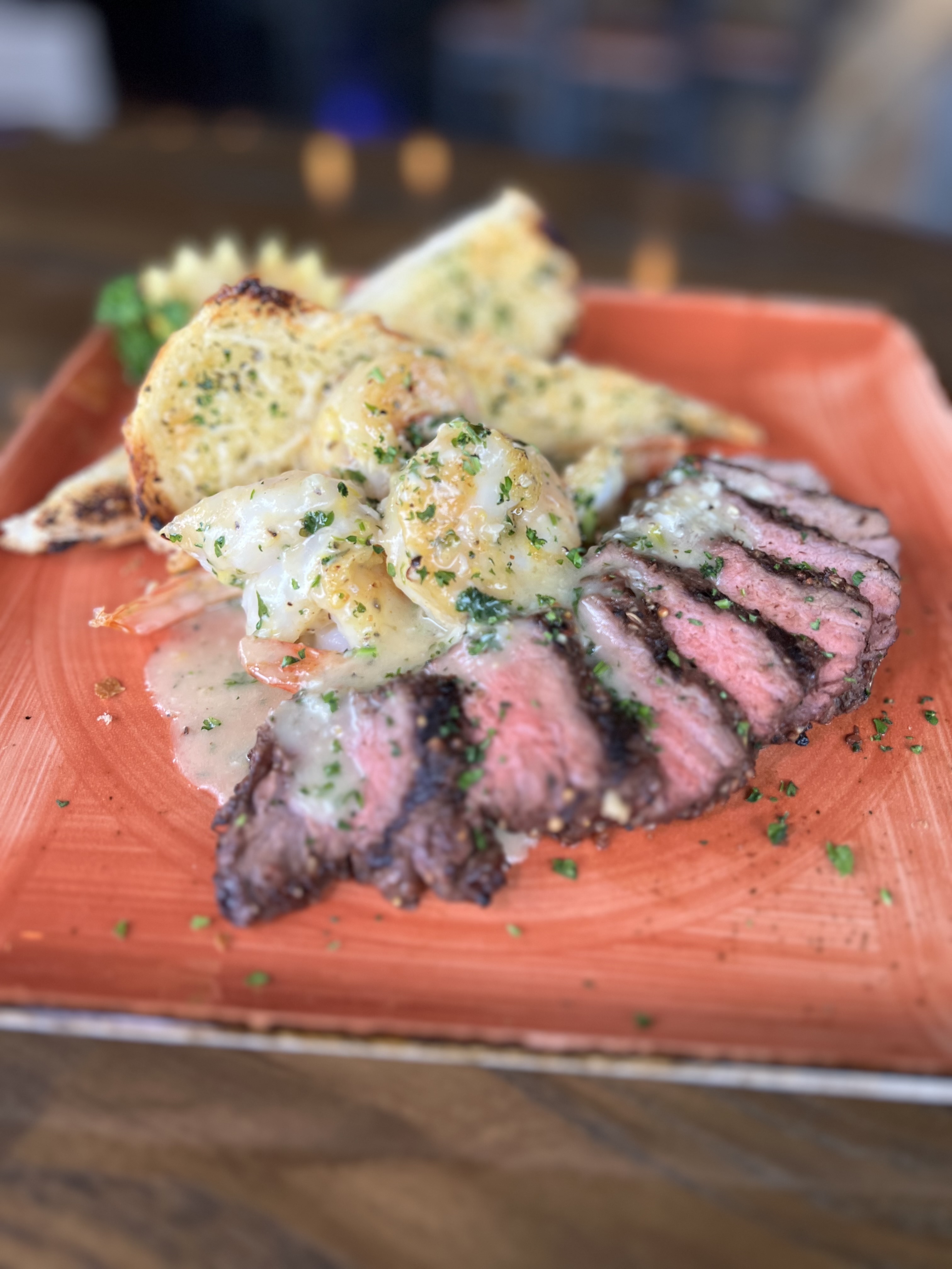 Char-broiled top sirloin served with shrimp scampi and garlic toast points Management reserves all rights. See bar host for details. *Thoroughly cooking food of animal origin, including but not limited to beef, eggs, fish, lamb, milk, poultry, or shellstock reduces the risk of foodborne illness. Young children, the elderly and individuals with certain health conditions may be at a higher risk if these foods are consumed raw or undercooked.