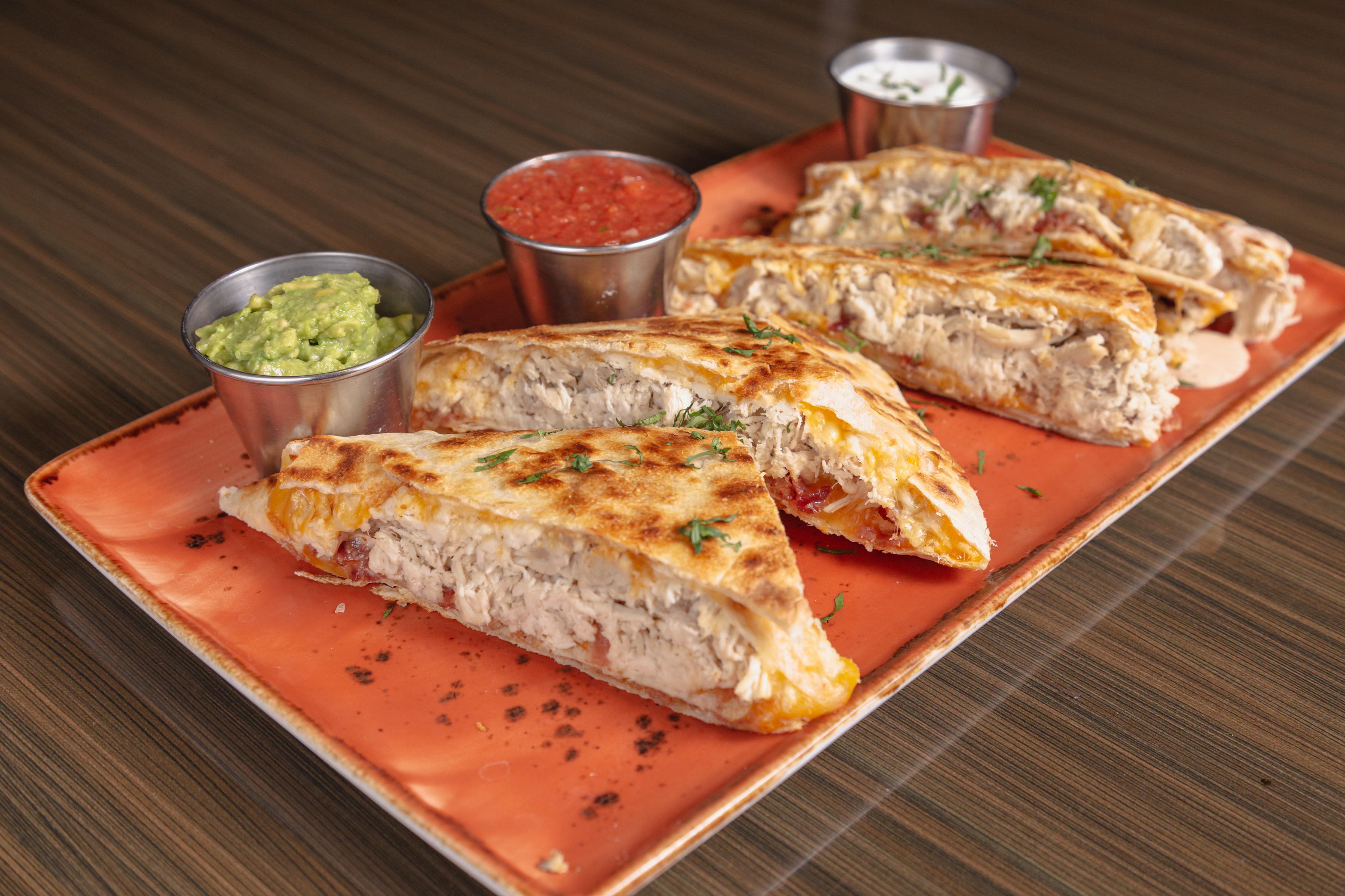 Flour tortilla, pepper jack & cheddar cheeses, roasted pulled chicken, smoked bacon, chipotle ranch dressing, pico de gallo, guacamole, sour cream